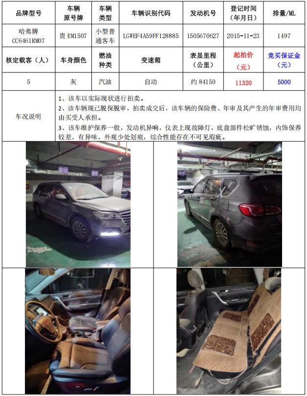 拍品編號(hào)6:哈弗牌CC6461RM07小型普通客車1輛(車輛原號(hào)牌:貴EM1507)