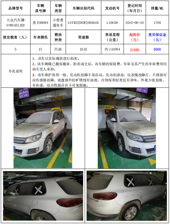 拍品編號(hào)7:大眾汽車牌SVW6451JED小型普通客車1輛(車輛原號(hào)牌:貴E90689)