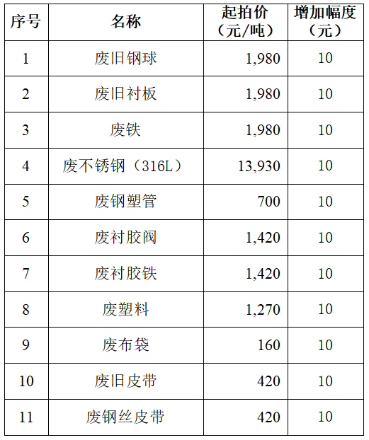 該標的為整體拍賣,以第1項廢舊鋼球起拍單價1980元/噸進行競價,采取增價方式競拍,每次每噸加價10元,上不封頂;廢舊鋼球每增加10元/噸,第2-11項廢舊材料同步增加10元/噸。