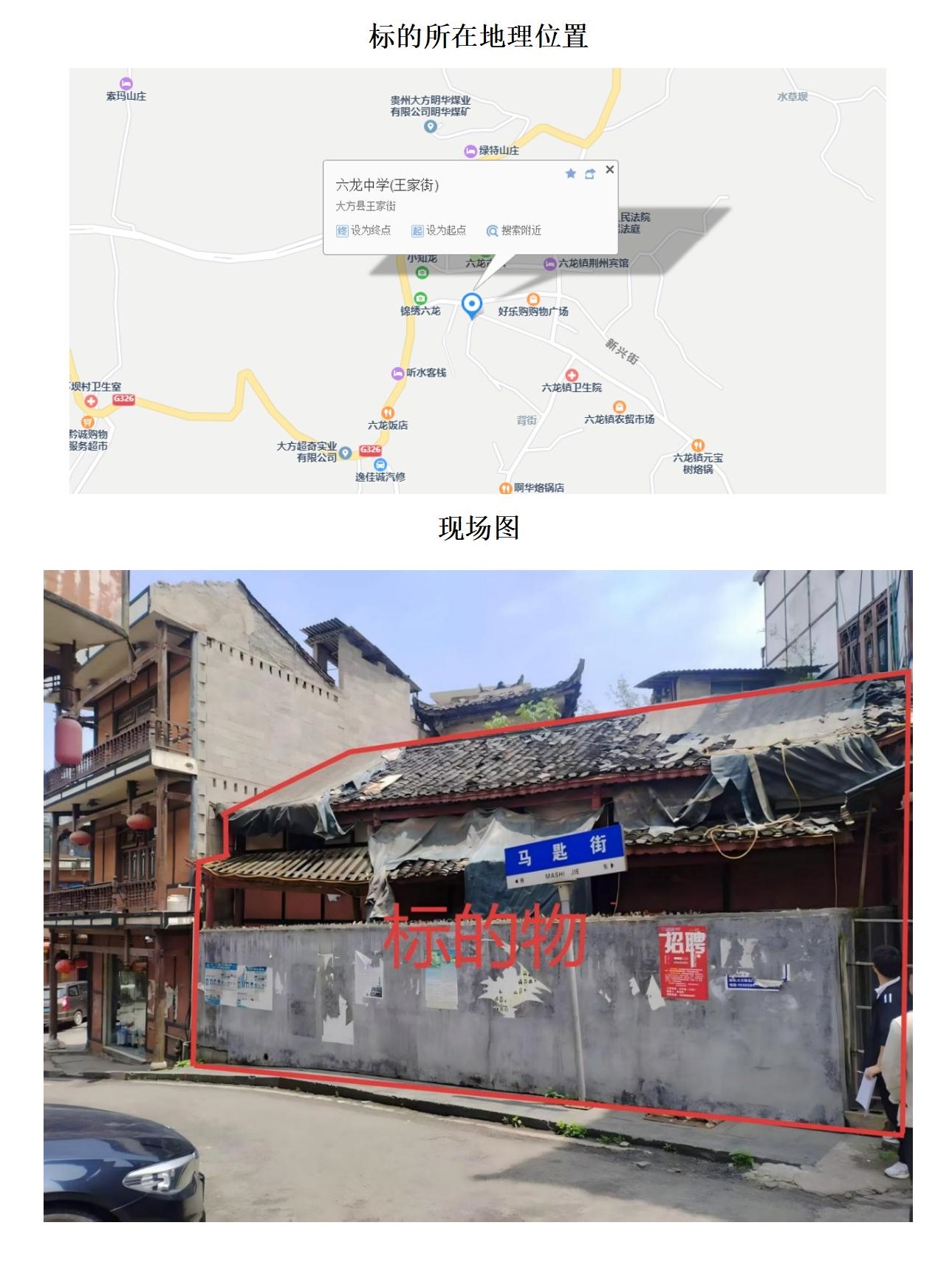 標(biāo)的位于六龍鎮(zhèn)。建筑面積:95.43㎡,土地面積:96.67㎡,建筑結(jié)構(gòu)為磚木結(jié)構(gòu),總層數(shù)為1層,房屋用途為住宅,土地性質(zhì)為劃撥。