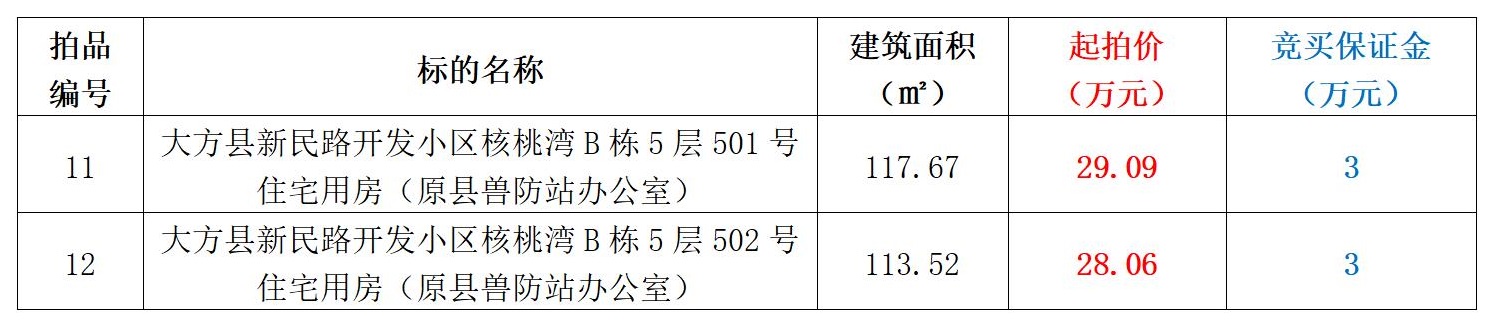 11、大方縣新民路開(kāi)發(fā)小區(qū)核桃灣B棟5層501號(hào)住宅用房(原縣獸防站辦公室),建筑面積:117.67㎡,起拍價(jià):29.09萬(wàn)元,競(jìng)買(mǎi)保證金:3萬(wàn)元。