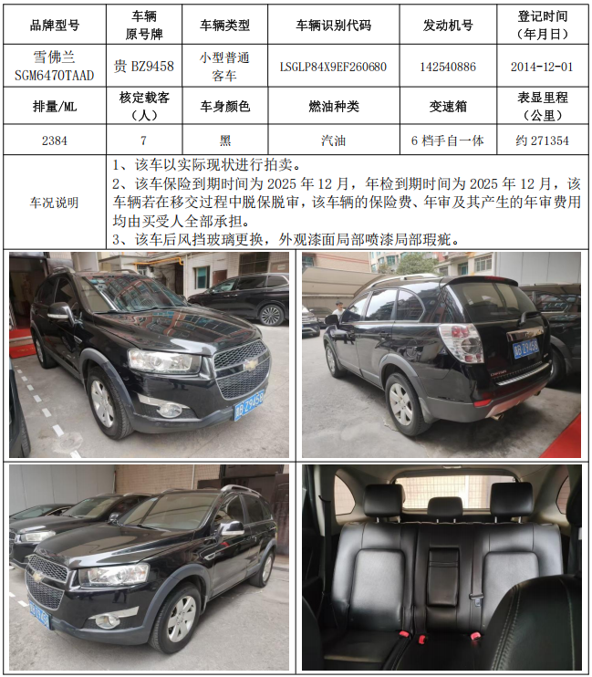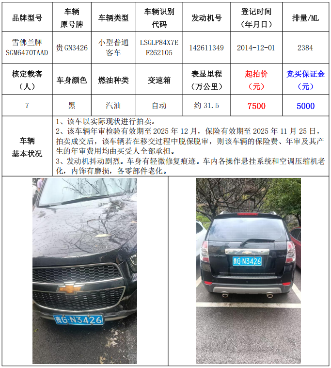 拍品編號(hào)1:雪佛蘭牌SGM6470TAAD小型普通客車(車輛原號(hào)牌:貴GN3426)