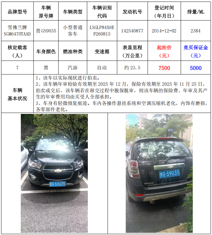 1、雪佛蘭牌SGM6470TAAD小型普通客車1輛,起拍價(jià):7500元,競(jìng)買保證金:5000元。