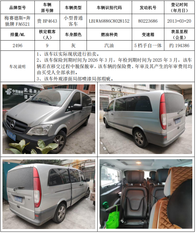 拍品編號(hào)4:雪佛蘭牌SGM6470TAAD小型普通客車1輛、梅賽德斯-奔馳牌FA6521小型普通客車1輛,共計(jì)2輛,整體拍賣