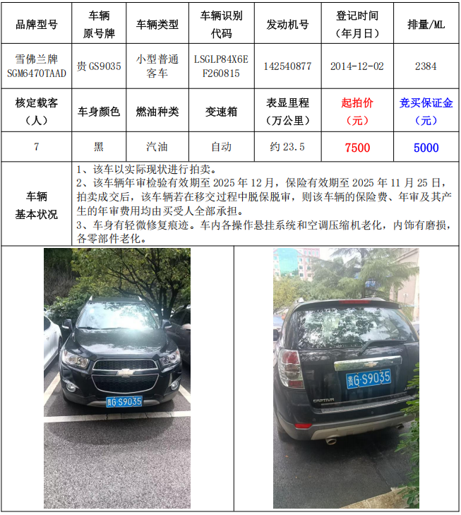拍品編號(hào)1:雪佛蘭牌SGM6470TAAD小型普通客車(車輛原號(hào)牌:貴GS9035)