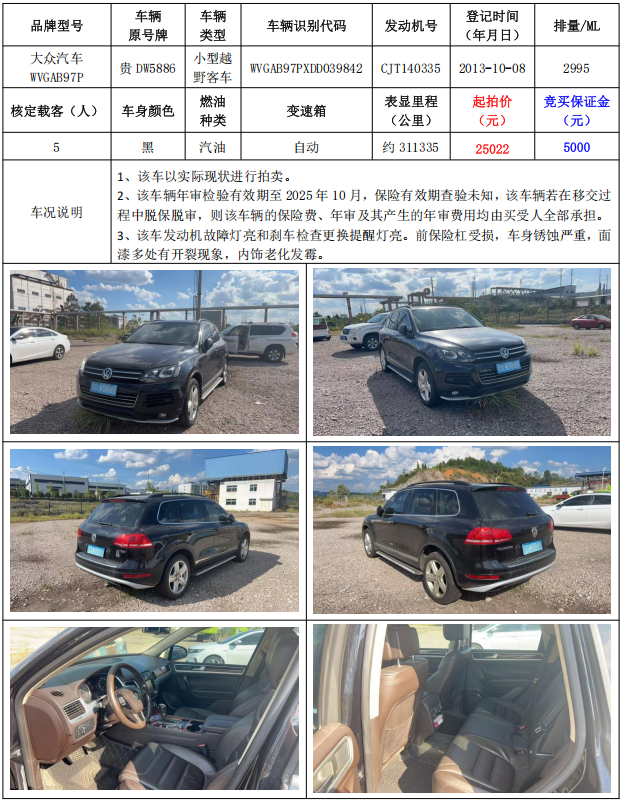 拍品編號(hào)2:大眾汽車WVGAB97P小型越野客車1輛(車輛原號(hào)牌:貴DW5886)