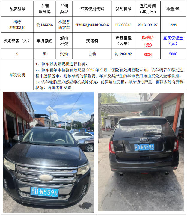 3、福特2FMDK3J9小型普通客車1輛,起拍價(jià):8834元,競(jìng)買(mǎi)保證金:5000元。