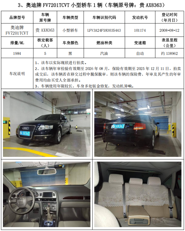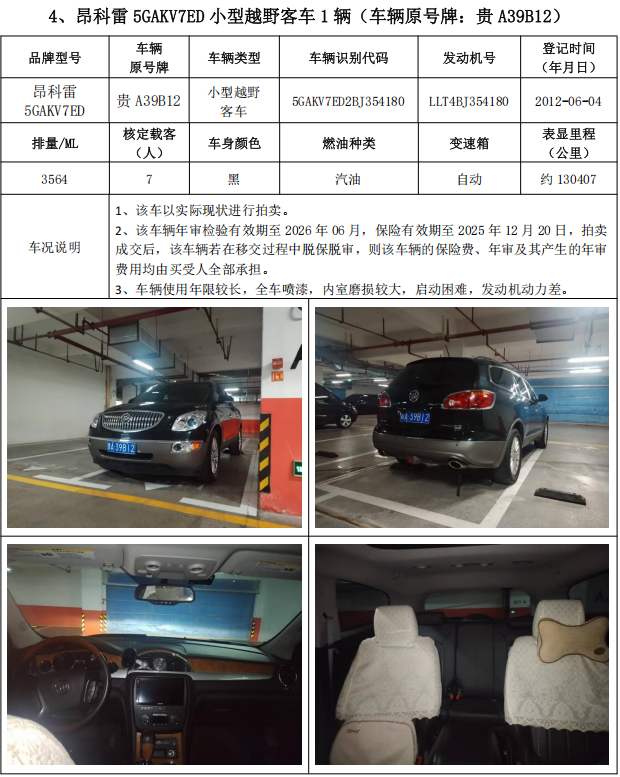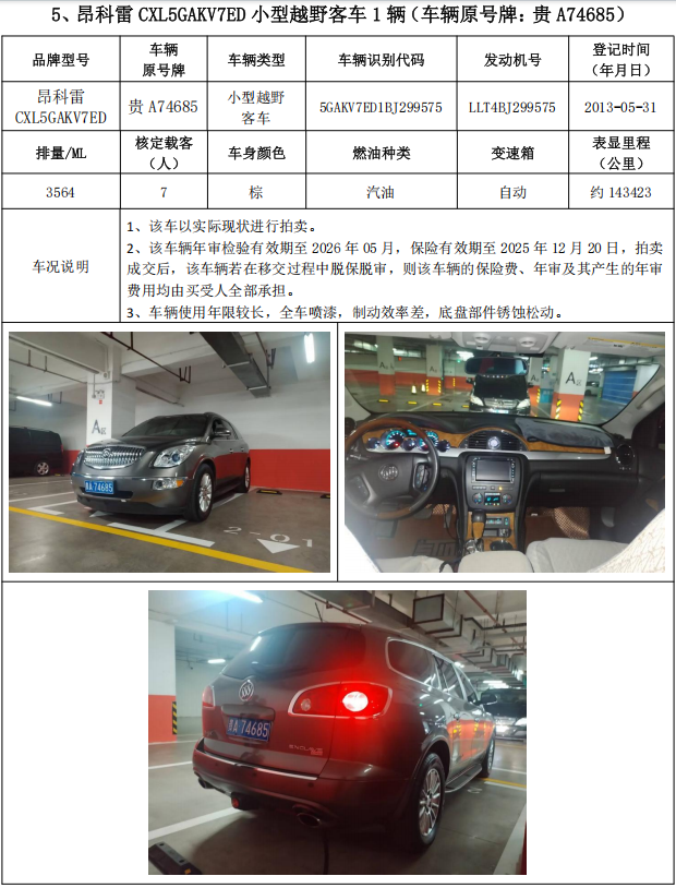普瑞維亞小型普通客車1輛、奧迪牌小型轎車2輛、昂科雷小型越野客車2輛,共計(jì)5輛,整體拍賣。