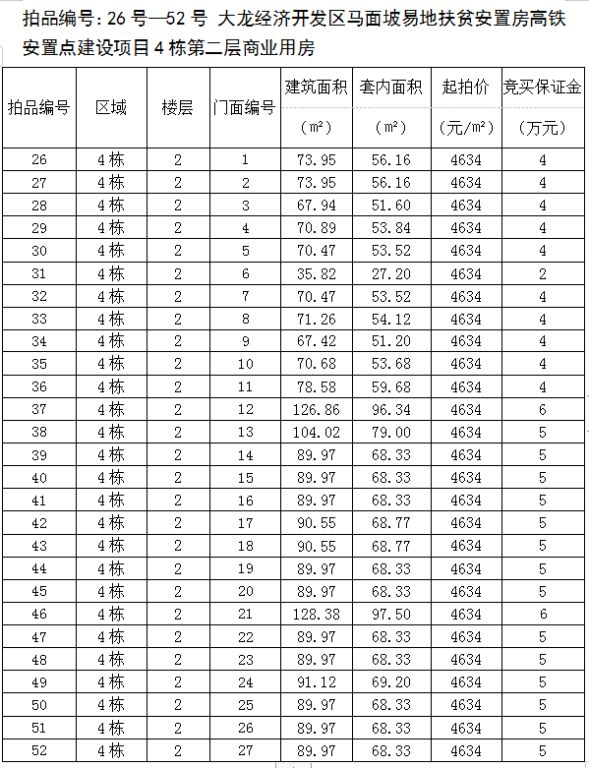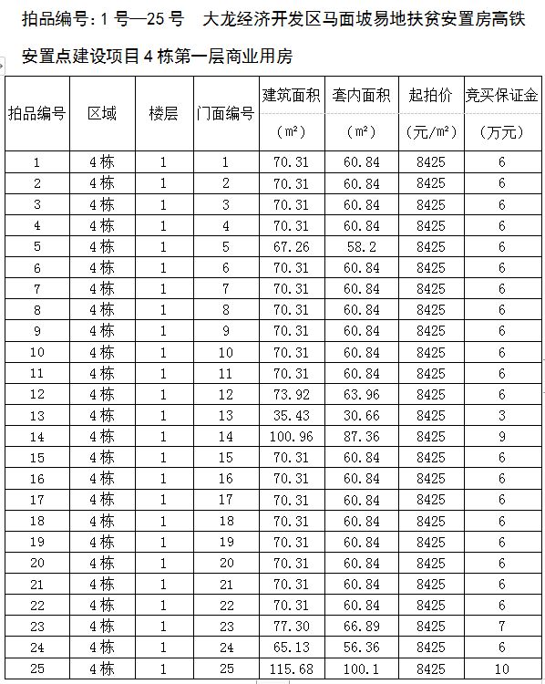 1、大龍經(jīng)濟(jì)開(kāi)發(fā)區(qū)馬面坡易地扶貧安置房高鐵安置點(diǎn)建設(shè)項(xiàng)目4棟第一層商業(yè)用房25間,建筑面積為35.43㎡-115.68㎡,起拍價(jià):8425元/㎡,競(jìng)買保證金3—10萬(wàn)元/間;