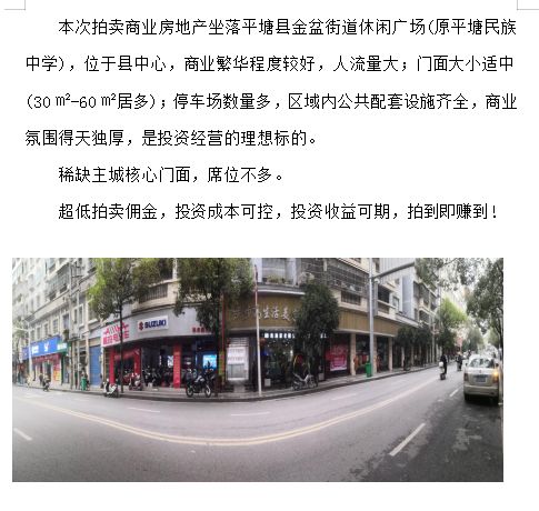 標(biāo)的位于平塘縣金盆街道休閑廣場(chǎng),相當(dāng)于縣中心,人流量大,交通便利,停車場(chǎng)數(shù)量多,商業(yè)繁華程度較好;二號(hào)樓建成于2005年,總層數(shù)6層,1層為商業(yè);建筑面積:43.8㎡,建筑結(jié)構(gòu)為磚混,外墻為貼磚,土地性質(zhì):國(guó)有劃撥,土地用途:商業(yè)用地;區(qū)域內(nèi)公共配套設(shè)施有平塘民族中學(xué)、平塘中等職民族中學(xué)、平塘中等職業(yè)學(xué)校、貴品廣場(chǎng)等。