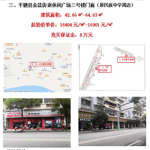 標(biāo)的位于平塘縣金盆街道休閑廣場(chǎng),相當(dāng)于縣中心,人流量大,交通便利,停車場(chǎng)數(shù)量多,商業(yè)繁華程度較好;三號(hào)樓建成于2004年,總層數(shù)7層,1層為商業(yè);建筑面積:42.66㎡-64.63㎡,建筑結(jié)構(gòu)為磚混,外墻為貼磚,土地性質(zhì):國(guó)有劃撥,土地用途:商業(yè)用地;區(qū)域內(nèi)公共配套設(shè)施有平塘民族中學(xué)、平塘中等職業(yè)學(xué)校、貴品廣場(chǎng)等。
