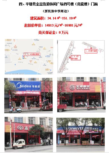 四、平塘縣金盆街道休閑廣場(chǎng)四號(hào)樓(競(jìng)能樓)13間門面(建筑面積:34.14㎡-151.19㎡)