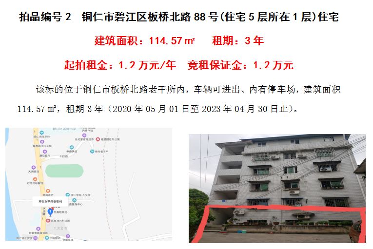 2、銅仁市碧江區(qū)板橋北路88號(hào)(住宅5層所在1層)住宅3年租賃權(quán)(建筑面積:114.57㎡);起拍租金單價(jià):1.20萬(wàn)元/年;競(jìng)租保證金:1.20萬(wàn)元;