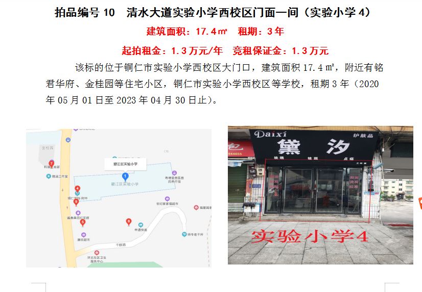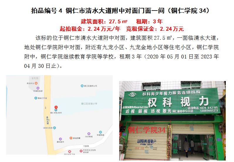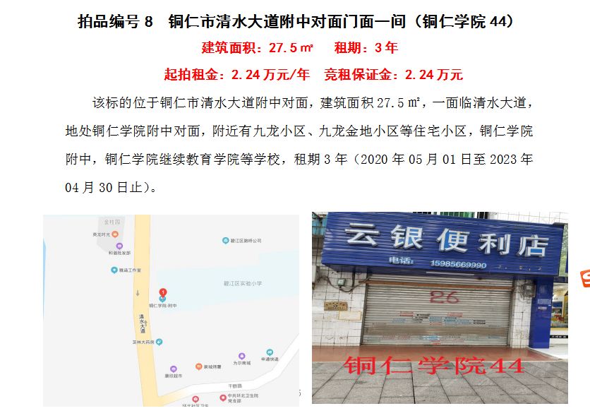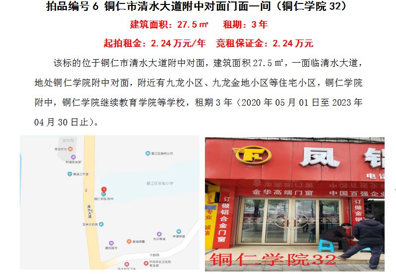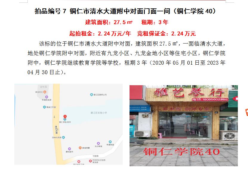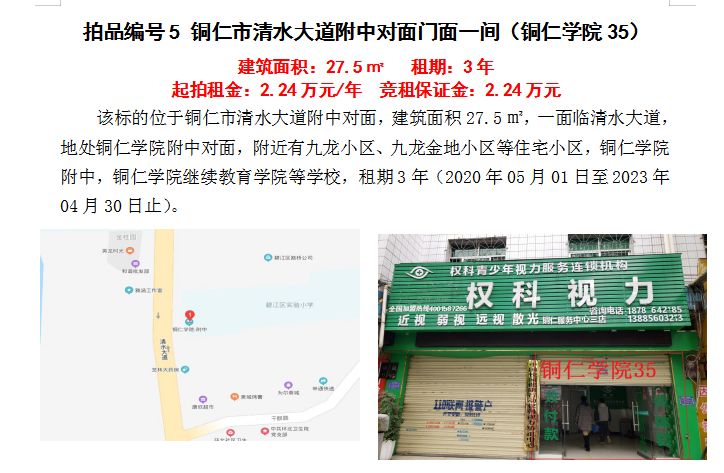 4、銅仁市清水大道附中對(duì)面門面五間3年租賃權(quán)(建筑面積:27.5㎡/間);起拍租金單價(jià)(每間):2.24萬(wàn)元/年;競(jìng)租保證金(每間):2.24萬(wàn)元;