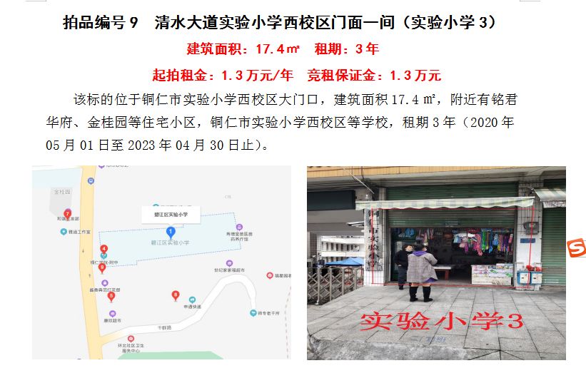 3、銅仁市清水大道附中對(duì)面門面一間3年租賃權(quán)(建筑面積:26㎡);起拍租金單價(jià):2.12萬(wàn)元/年;競(jìng)租保證金:2.12萬(wàn)元;