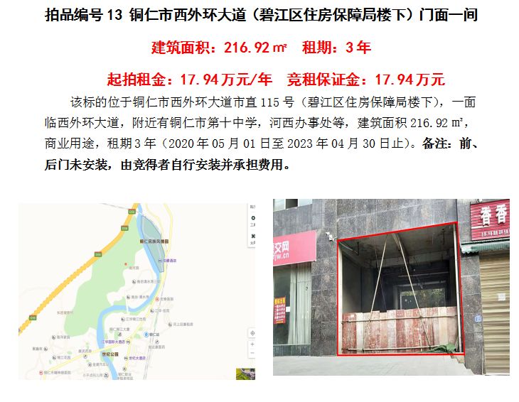 7、銅仁市西外環(huán)大道(碧江區(qū)住房保障局樓下)門面一間3年租賃權(quán)(建筑面積:216.92㎡);起拍租金單價(jià):17.94萬(wàn)元/年;競(jìng)租保證金:17.94萬(wàn)元;