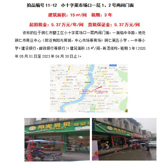 6、小十字菜市場(chǎng)口一層1-2號(hào)兩間門面3年租賃權(quán)(建筑面積15㎡/間);起拍租金單價(jià)(每間):5.37萬(wàn)元/年;競(jìng)租保證金(每間):5.37萬(wàn)元;